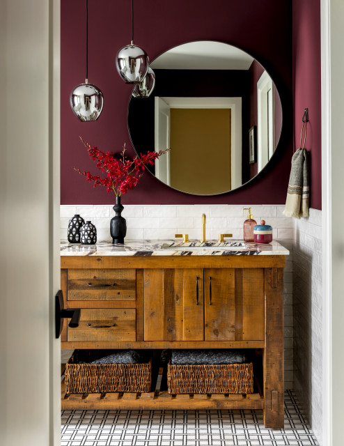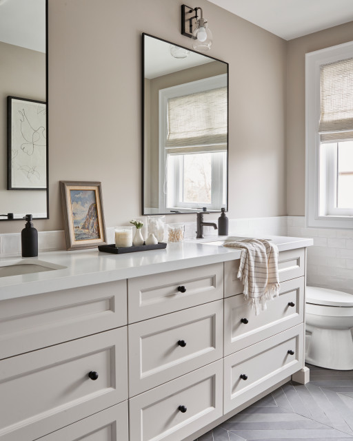 I like mixing different types of grassy woven baskets in similar but not matching tones to add natural variety without anything clashing. Use baskets without lids for items like fresh towels, and a few with lids for toilet paper, used towels or garbage.